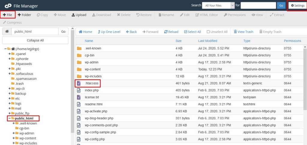 Di cpanel untuk membuat file baru, klik ikon di kiri kanan atas dan buat file baru. Sedangkan untuk opsi show hidden files ada di tombol Settings di sebelah kanan atas.